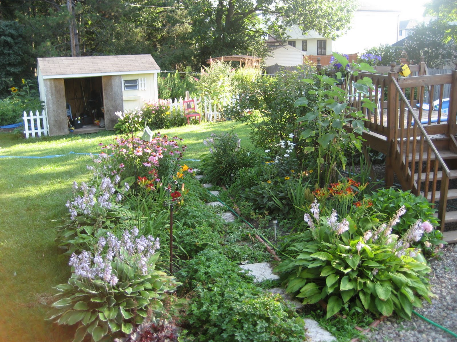 The garden is looking its best right now. Summer flowers in full bloom, variegated greens, bright yellows and subtle whites and blues. There is color in every part of the yard. Beautiful bright sunny hot days. We have been steaming in the 80's and 90's and haven't had any rain in my back yard for a week. That means a bit of watering will have to happen this weekend.